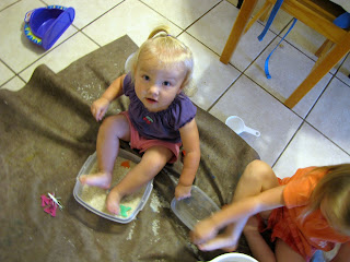 I loaded up two large containers with rice, hid a few toys inside, and let the girls go at it. Finding the toys was pretty easy, but they really enjoyed scooping and pouring the rice and transferring it between containers.