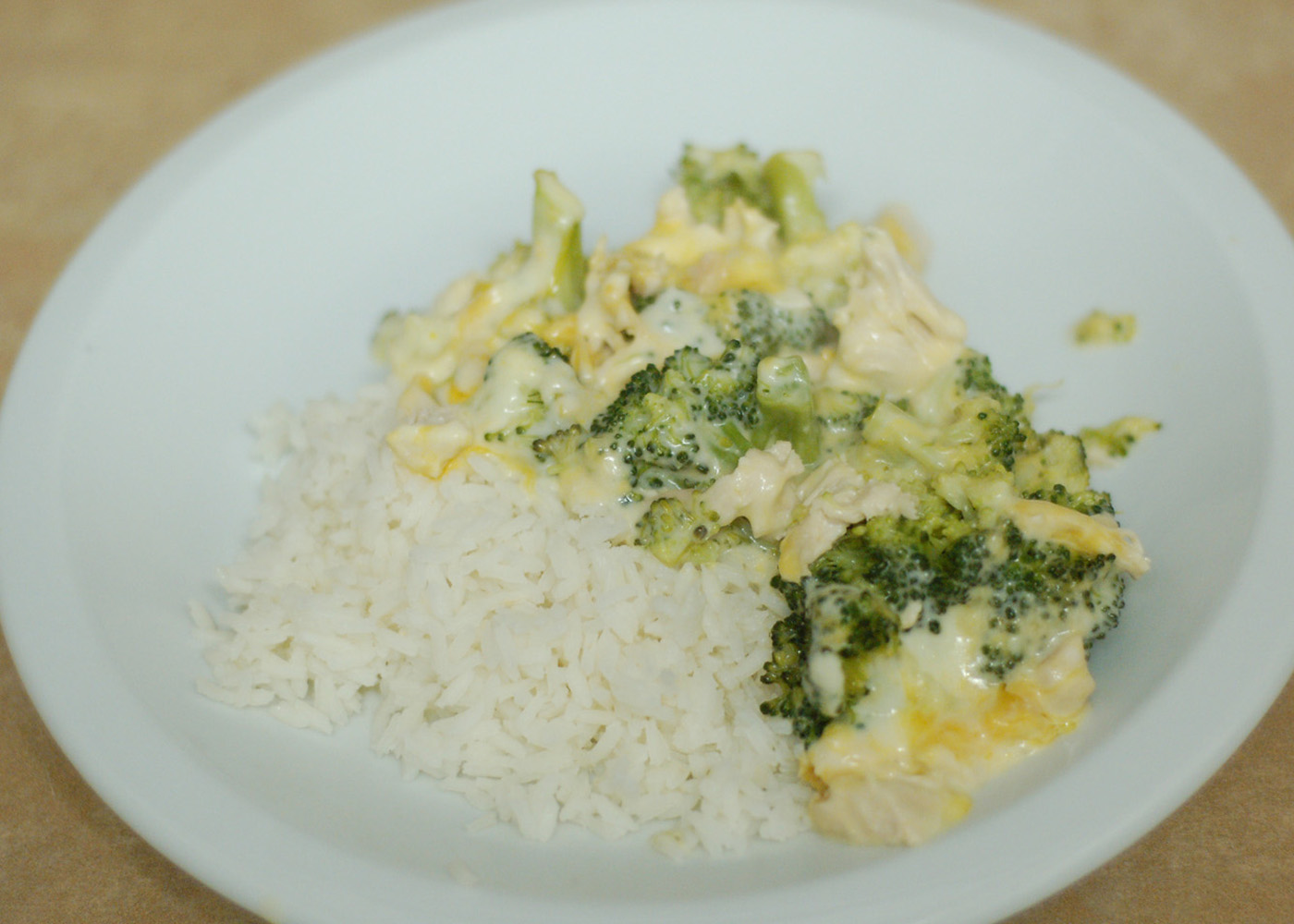 Preheat oven to 325 degrees. Boil or grill chicken and cut into small pieces. While the chicken is cooking, prepare broccoli and steam for 7 or so minutes. Mix well the cream of chicken soup, sour cream, and water in bowl. In 9×13 pan put softened broccoli, then spread chicken chunks evenly. Pour cream of chicken mixture evenly over the top and then spread grated cheddar cheese last. Spray a piece of foil with non-stick oil (so the cheese doesn’t stick while baking) and cover pan. Bake until heated through and cheese is melted and bubbly, about 20-30 minutes. Serve over cooked rice.
